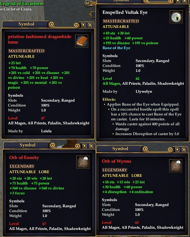 Zur Zeit favorisiere ich Enspelled Vultak Eye wegen dem 400 Ward und Orb of Eternity wegen den vielen + auf Attribute und +3 Focus.