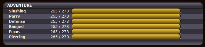 Habe zB bei allen Kampfskills (also zB in Slashing, Parry, Defence, usw) nun mittlerweile überall 265 von 273 möglichen Skillpoints?