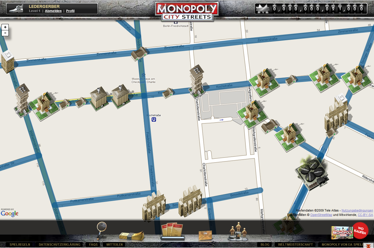 Die Macher von Monopoly haben eine gar nicht mal so doofe Idee verwirklicht und das Ganze um Werbung für das neue Spiel Monopoly City zu machen. In Kooperation haben sie Google Maps benutzt, um ein Online Browser Spiel zu erschaffen, dass die ganze Welt als Spielbrett hat. Überall kann man Straßen kaufen und darauf Häuser bauen. Das "Gehe über Los" oder die "Gefängnisfreikarte" gibt es in diesem Fall nicht, aber man kann gegen die ganze Welt spielen, hat irgendwie was