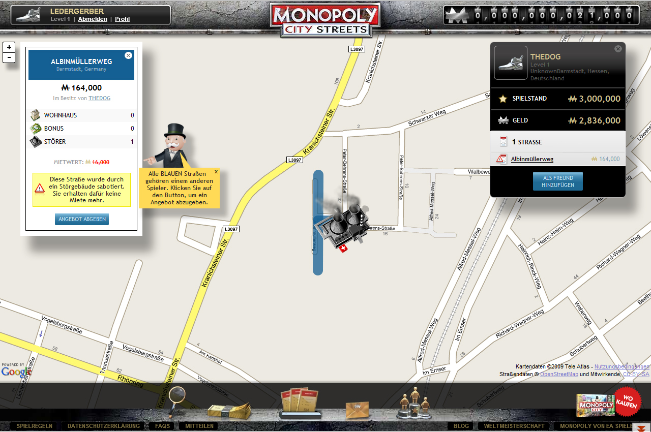 Was passiert, wenn man das Brettspiel Monopoly mit Google Maps, Tele Atlas und Openstreetmap zusammenwürfelt? Die Antwort ist Monopoly City Streets, ein Spiel, das weltweit ausgetragen wird - und eine Mischung aus Faszination und Langeweile auslöst.