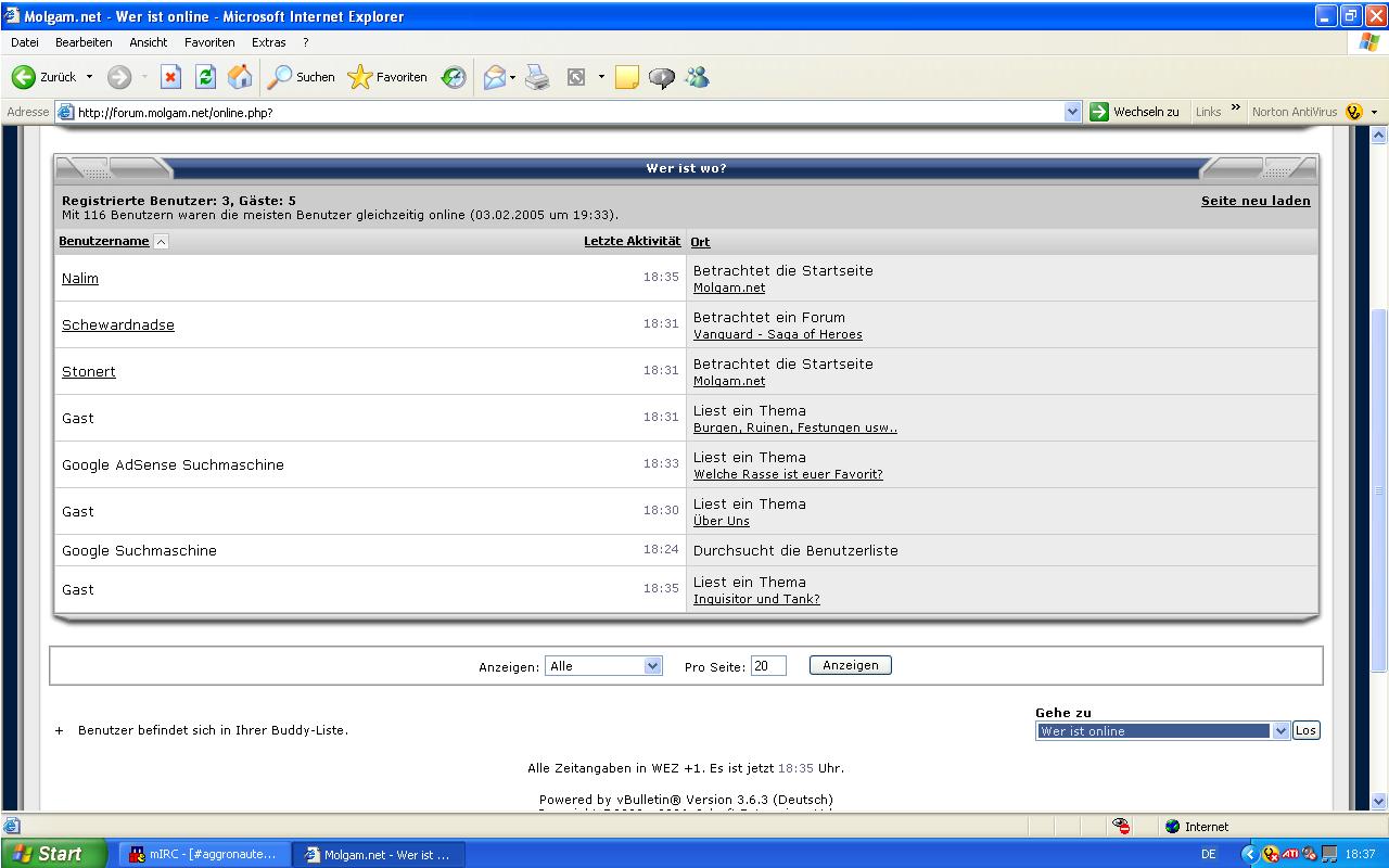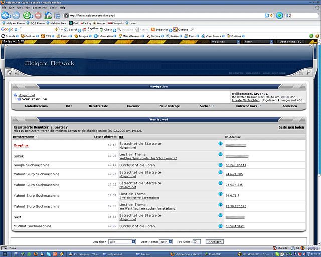 Das sind doch noch wenig. Letztens hab ich ja über mehere Tage eine ganze Zeitlang die 'who is online Liste' betrachtet. Da waren noch eine Hand mehr Bots da u.a. Yahoo in vielen Variation ect.